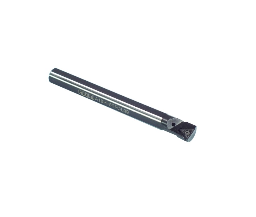 Soustružnický nůž vyvrtávací A10H-STFCL09. Průměr držáku je 10 mm, celková délka 100 mm. Hlava držáku má tvar F a úhel nastavení 90°. Do držáku se upínají destičky trojúhelníkového tvaru s délkou řezné hrany 5,56 mm. Úhel hřbetu destičky je 7°, směr