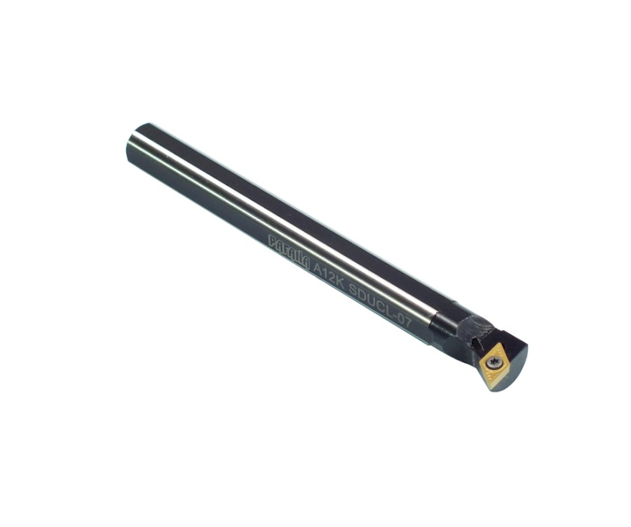 Soustružnický nůž vyvrtávací A12KSDUCL07. Průměr držáku je 12 mm, celková délka 125 mm. Hlava držáku má tvar U a úhel nastavení 93°. Do držáku se upínají destičky kosočtvercového tvaru s úhlem 55° s délkou řezné hrany 6,35 mm. Úhel hřbetu destičky j