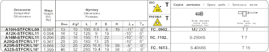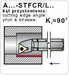 Soustružnický nůž vyvrtávací A12KSTFCR11. Průměr držáku je 12 mm, celková délka 125 mm. Hlava držáku má tvar F a úhel nastavení 90°. Do držáku se upínají destičky trojúhelníkového tvaru s délkou řezné hrany 6,35 mm. Úhel hřbetu destičky je 7°, směr