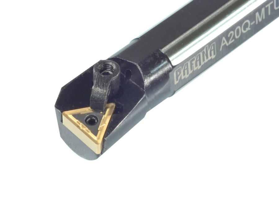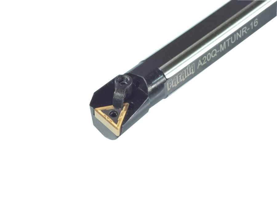 Soustružnický nůž vyvrtávací A20Q-MTUNR16. Průměr držáku je 20 mm, celková délka 180 mm. Hlava držáku má tvar U a úhel nastavení 93°. Do držáku se upínají destičky trojúhelníkového tvaru s délkou řezné hrany 9,525 mm. Úhel hřbetu destičky je 0°, směr