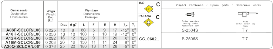 Soustružnický nůž vyvrtávací A20Q-SCLCL06. Průměr držáku je 20 mm, celková délka 180 mm. Hlava držáku má tvar L a úhel nastavení 95°. Do držáku se upínají destičky kosočtvercového tvaru s úhlem 80° s délkou řezné hrany 6,35 mm. Úhel hřbetu destičky j