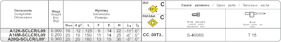 Soustružnický nůž vyvrtávací A20Q-SCLCR09R. Průměr držáku je 20 mm, celková délka 180 mm. Hlava držáku má tvar L a úhel nastavení 95°. Do držáku se upínají destičky kosočtvercového tvaru s úhlem 80° s délkou řezné hrany 9,525 mm. Úhel hřbetu destičky