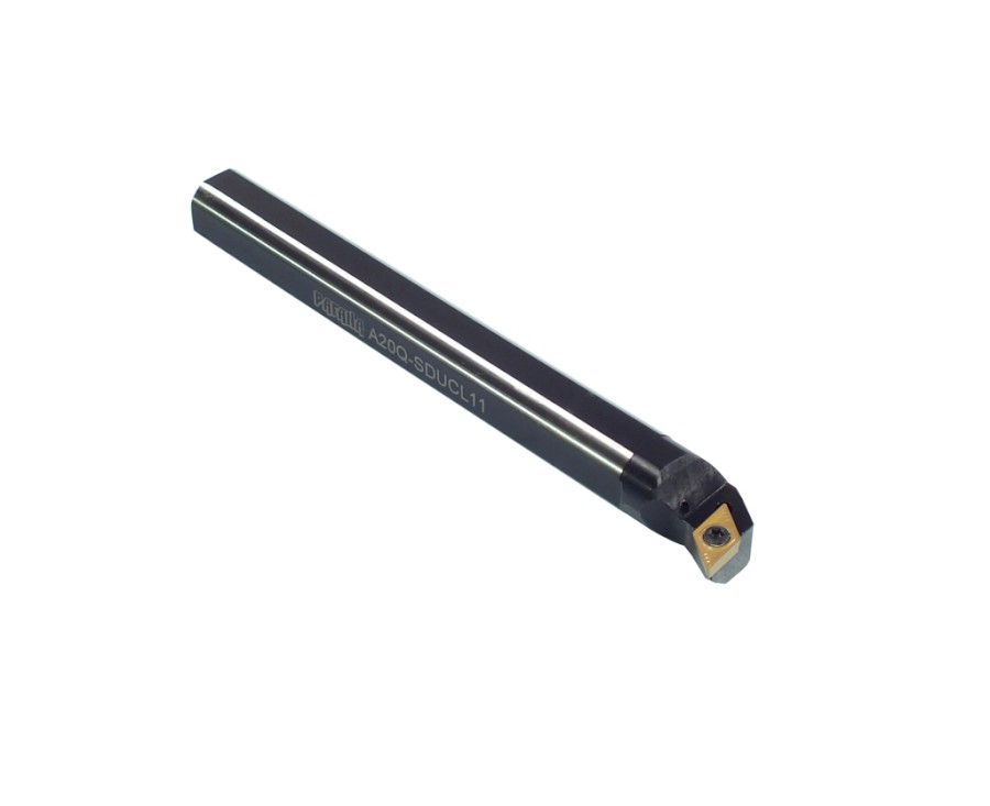 Soustružnický nůž vyvrtávací A20Q-SDUCL11. Průměr držáku je 20 mm, celková délka 180 mm. Hlava držáku má tvar U a úhel nastavení 93°. Do držáku se upínají destičky kosočtvercového tvaru s úhlem 55° s délkou řezné hrany 9,525 mm. Úhel hřbetu destičky
