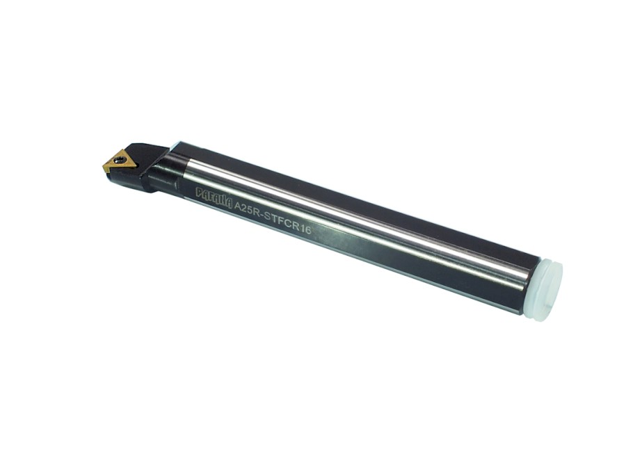 Soustružnický nůž vyvrtávací A25R-STFCR16. Průměr držáku je 25 mm, celková délka 200 mm. Hlava držáku má tvar F a úhel nastavení 90°. Do držáku se upínají destičky trojúhelníkového tvaru s délkou řezné hrany 9,525 mm. Úhel hřbetu destičky je 7°, směr