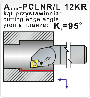 Soustružnický nůž vyvrtávací A25RPCLNL12KR. Průměr držáku je 25 mm, celková délka 200 mm. Hlava držáku má tvar L a úhel nastavení 95°. Do držáku se upínají destičky kosočtvercového tvaru s úhlem 80° s délkou řezné hrany 12,7 mm. Úhel hřbetu destičky
