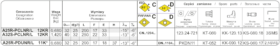Soustružnický nůž vyvrtávací A25RPCLNR12KR. Průměr držáku je 25 mm, celková délka 200 mm. Hlava držáku má tvar L a úhel nastavení 95°. Do držáku se upínají destičky kosočtvercového tvaru s úhlem 80° s délkou řezné hrany 12,7 mm. Úhel hřbetu destičky