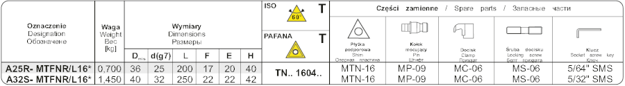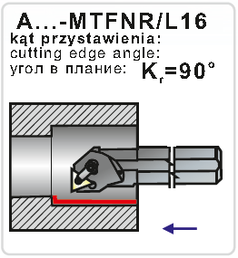 Soustružnický nůž vyvrtávací A32S-MTFNR16. Průměr držáku je 32 mm, celková délka 250 mm. Hlava držáku má tvar F a úhel nastavení 90°. Do držáku se upínají destičky trojúhelníkového tvaru s délkou řezné hrany 9,525 mm. Úhel hřbetu destičky je 0°, směr
