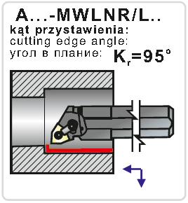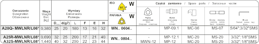 Soustružnický nůž vyvrtávací A32S-MWLNR08. Průměr držáku je 32 mm, celková délka 250 mm. Hlava držáku má tvar L a úhel nastavení 95°. Do držáku se upínají destičky trigonového tvaru s úhlem 80° s délkou řezné hrany 12,7 mm. Úhel hřbetu destičky je 0°