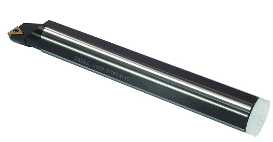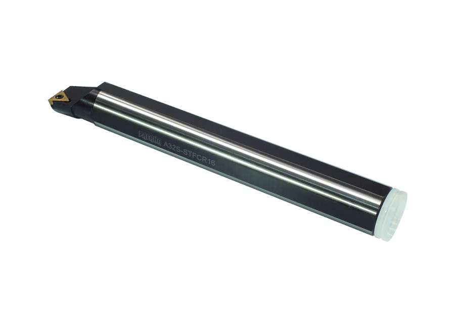 Soustružnický nůž vyvrtávací A32S-STFCR16. Průměr držáku je 32 mm, celková délka 250 mm. Hlava držáku má tvar F a úhel nastavení 90°. Do držáku se upínají destičky trojúhelníkového tvaru s délkou řezné hrany 9,525 mm. Úhel hřbetu destičky je 7°, směr