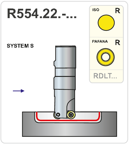 Stopková fréza R554.22-2525 pravotočivá s průměrem pracovní části 25 mm a velikostí úchytu 25 mm. Čelní fréza s kruhovou destičkou (E podle normy). Do frézy se upínají destičky typu R - kruhového tvaru, způsob upínání destiček S - šroubem v kuželovém