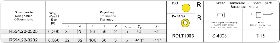 Stopková fréza R554.22-3232 pravotočivá s průměrem pracovní části 32 mm a velikostí úchytu 32 mm. Čelní fréza s kruhovou destičkou (E podle normy). Do frézy se upínají destičky typu R - kruhového tvaru, způsob upínání destiček S - šroubem v kuželovém
