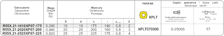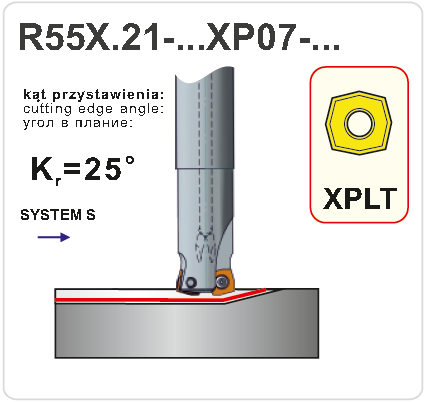 Stopková fréza R55X.21-2525XP07-225 pravotočivá s průměrem pracovní části 25 mm a velikostí úchytu 25 mm. Čelní fréza s úhlem k=25° (Y podle normy). Destičky se do frézy upínají způsobem S - šroubem v kuželovém otvoru. Typ uchycení frézy - stopka vál