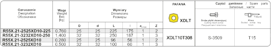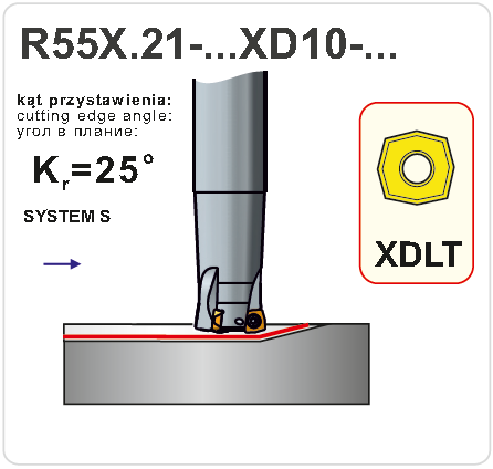 Stopková fréza R55X.21-3232XD10 pravotočivá s průměrem pracovní části 32 mm a velikostí úchytu 32 mm. Čelní fréza s úhlem k=25° (Y podle normy). Destičky se do frézy upínají způsobem S - šroubem v kuželovém otvoru. Typ uchycení frézy - stopka válcová