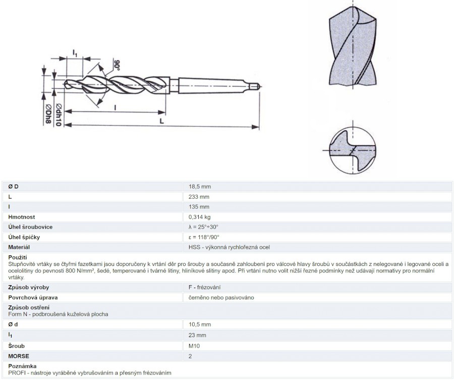 Stupňovitý vrták z výkonné rychlořezné oceli (HSS) k vrtání děr pro šrouby a současně zahloubení pro válcové hlavy šroubů. Celková délka je 233 mm a pracovní délka 135 mm.