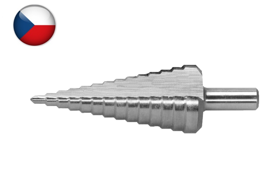 Stupňovitý vrták 4/12-1 HSS o průměru (4; 5; 6; 7; 8; 9; 10; 11; 12 mm), s celkovou délkou nástroje 65,0 mm a průměru stopky 6,0 mm.