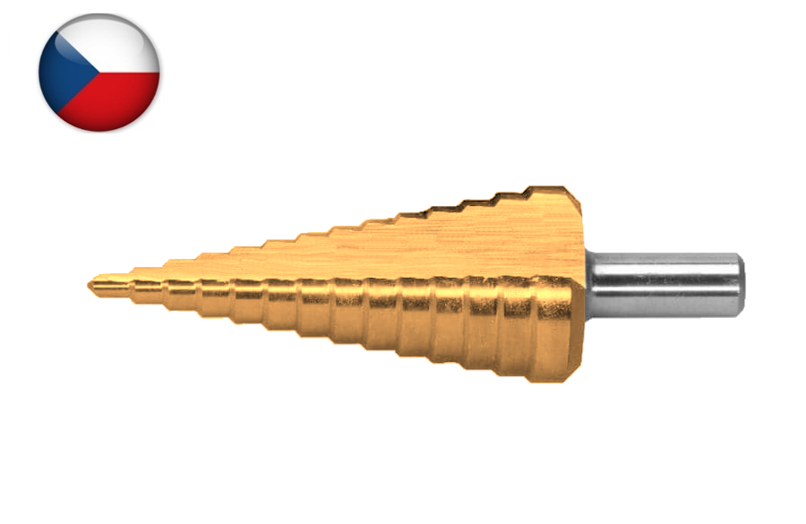 4-30 mm kobaltový stupňovitý vrták s povlakem TiN. Vrták má tyto průměry: 4,6,8,10,12,14,16,18,20,22,24,26,28,30mm. Pro vrtání rozdílných průměrů děr do plechu, plastu a tenkostěnných materiálů. Vrták je vyroben z rychlořezné oceli HSSCo5%.