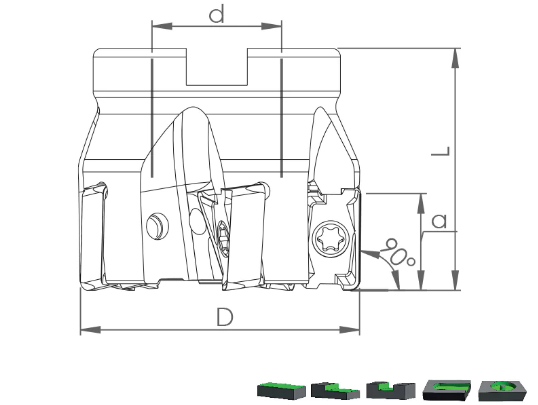 100,0 mm nástrčná fréza pro frézování do rohu užívající 8 destiček XNPU 15T6 , 90° úhlem nastavení a 32,0 mm připojovacím otvorem, s kanálky pro vnitřní chlazení.