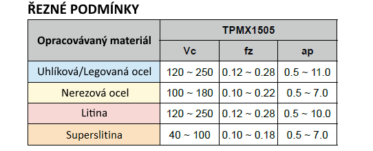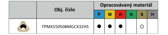 Jednostranné frézovací destičky TPMX 150508 MG CX32HS jsou určeny pro spolehlivé frézování ocelí, nerezových ocelí a litin a částečně i superslitin. Trojúhelníkové provedení destiček zajišťuje rovnoměrné rozložení řezných sil, klidný chod nástroje a stabilní průběh obrábění i při vyšším zatížení.