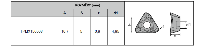 Jednostranné frézovací destičky TPMX 150508 MG CX33TX jsou trojúhelníkové, s rádiusem 0,8 mm a hloubkou řezu 10,7 mm, vhodné pro ocel, nerez, litinu, superslitiny a kalené materiály.