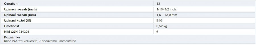 Tříčelisťové vrtačkové sklíčidlo s vnitřním upínacím kuželem B16. Součástí sady je také 6 mm klíč / klička pro upínání. Upínací rozsah od 1,5 do 13 mm.