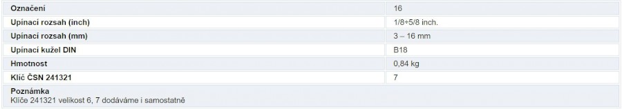 Tříčelisťové vrtačkové sklíčidlo s vnitřním upínacím kuželem B18. Součástí sady je také 7 mm klíč / klička pro upínání. Upínací rozsah od 3 do 16 mm.