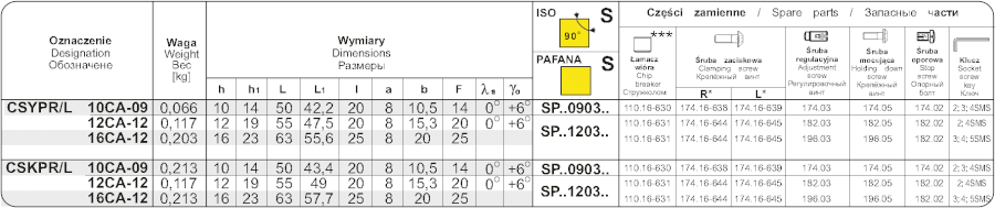 Vyvrtávací tyč CSYPL 12CA12. Šířka tyče od kraje po hranu destičky je 12 mm. Do tyče se upíná destička čtvercového tvaru s úhlem hřbetu 11°, délka řezné hrany destičky je 12,7 mm. Destička se do tyče upíná způsobem C, to je upínkou na plochu. Hlava d