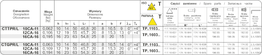 Vyvrtávací tyč CTGPL 12CA16. Šířka tyče od kraje po hranu destičky je 12 mm. Do tyče se upíná destička trojúhelníkového tvaru s úhlem hřbetu 11°, velikost destičky je 16. Destička se do tyče upíná způsobem C, to je upínkou na plochu. Hlava držáku má