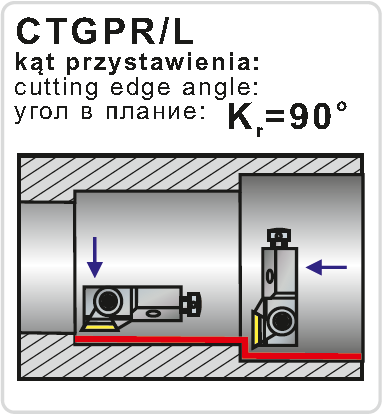 Vyvrtávací tyč CTGPL 16CA16. Šířka tyče od kraje po hranu destičky je 16 mm. Do tyče se upíná destička trojúhelníkového tvaru s úhlem hřbetu 11°, délka řezné hrany destičky je 9,525 mm. Destička se do tyče upíná způsobem C, to je upínkou na plochu. H
