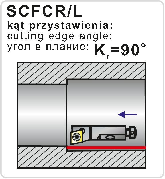 Vyvrtávací tyč SCGCL 10CA09. Šířka tyče od kraje po hranu destičky je 10 mm. Do tyče se upíná destička kosočtvercového tvaru s úhlem 80° s úhlem hřbetu 7°, velikost destičky je 9. Destička se do tyče upíná způsobem S, to je šroubem v kuželovém otvoru. Nejčastěji se toto upnutí užívá u nožů menších průřezů. Hlava držáku má tvar G a úhel nastavení 90°, směr řezu levý.