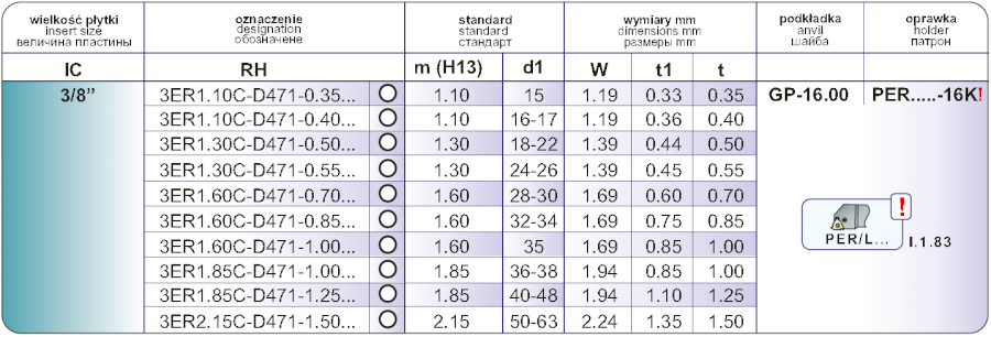 Zapichovací destička 3 ER 1,6C D471-1,0 VTX vnější pravá. Velikost destičky - průměr kružnice vepsané je IC 3/8", šířka drážky 1,6 mm, hloubka drážky 1 mm. Plný profil. Norma DIN 471.Třída karbidu VTX - nová univerzální třída, první volba.