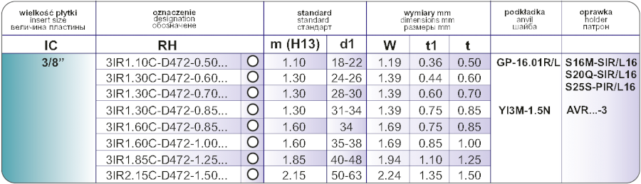 Zapichovací destička 3 IR 1,85C D472 1,25 VTX vnitřní pravá. Velikost destičky - průměr kružnice vepsané je IC 3/8", šířka drážky 1,85 mm, hloubka drážky 1,25 mm. Plný profil. Norma DIN 472.Třída karbidu VTX - nová univerzální třída, první volba.