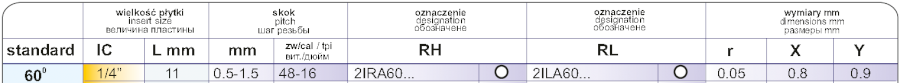 Závitovací destička 2 IR A60 VTX vnitřní pravá. Velikost destičky - průměr kružnice vepsané je IC 1/4". Neúplný profil 60°, skok závitu 0,5 - 1,5 mm.Třída karbidu VTX - nová univerzální třída, první volba.