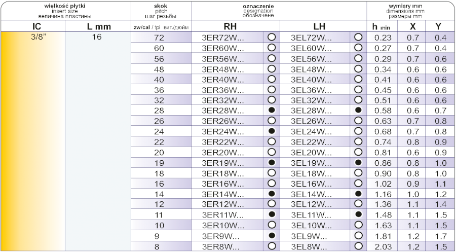 Závitovací destička 3 ER 19W VTX vnější pravá. Velikost destičky - průměr kružnice vepsané je IC 3/8". Plný profil, skok závitu 19 mm. Norma W - Withworth BS, třída karbidu VTX - nová univerzální třída, první volba.