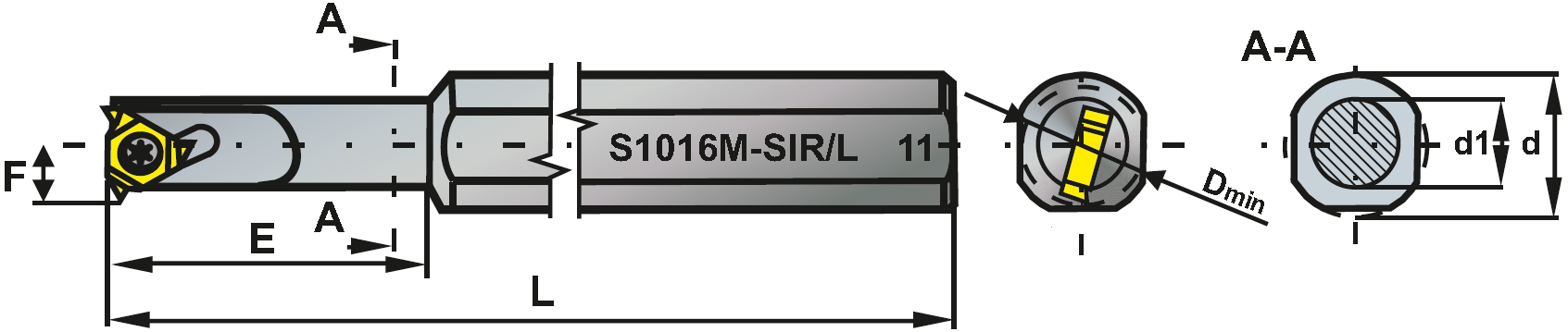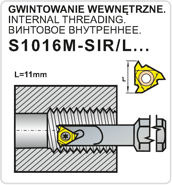 Závitový držák vnitřní S1016M-SIR11 pro vnitřní závitování. Délka držáku je 150 mm, průměr 16 mm, průměr zúžené části 10 mm. Do držáku se upínají destičky typu 2IR nebo 2IL.
